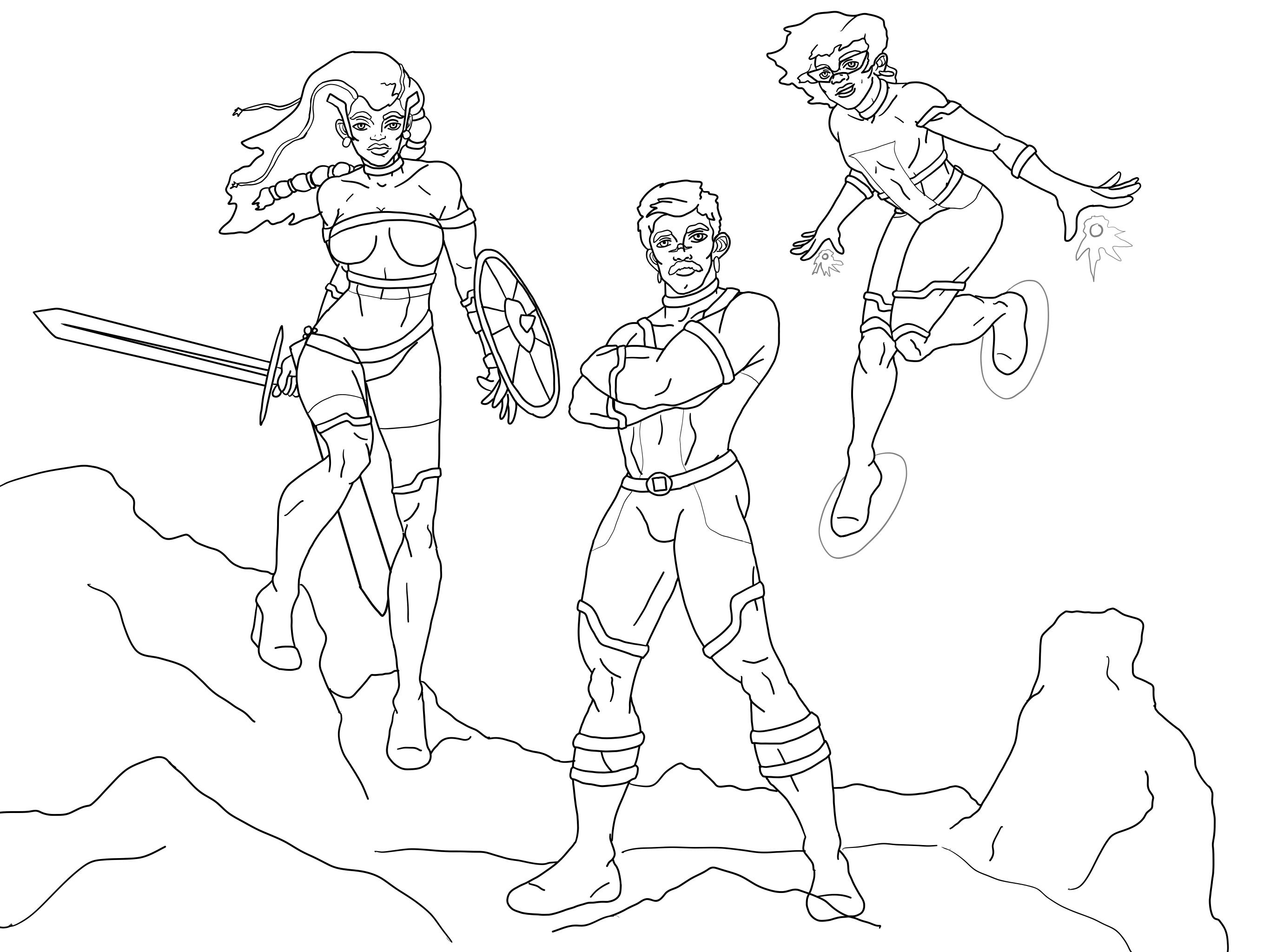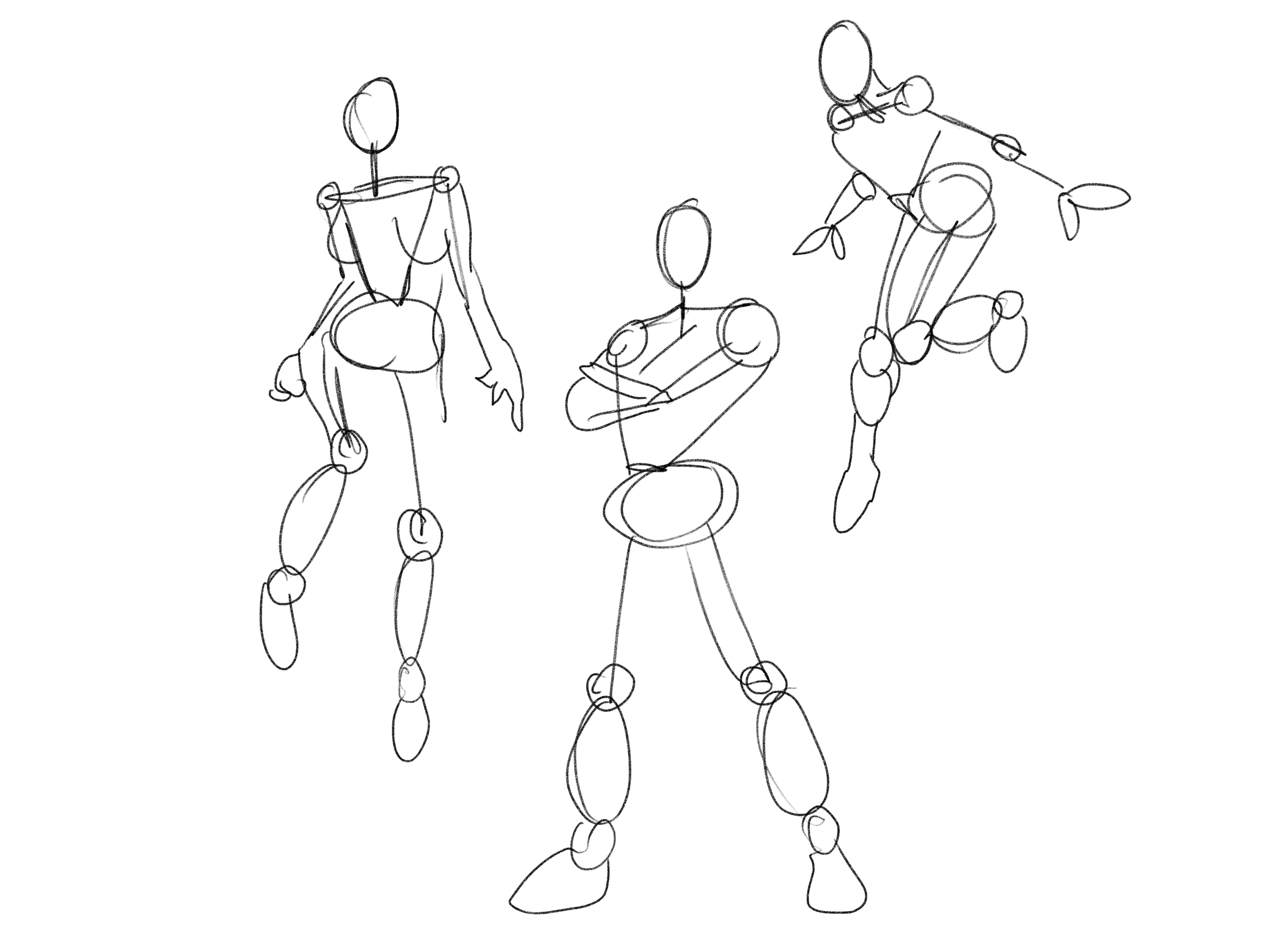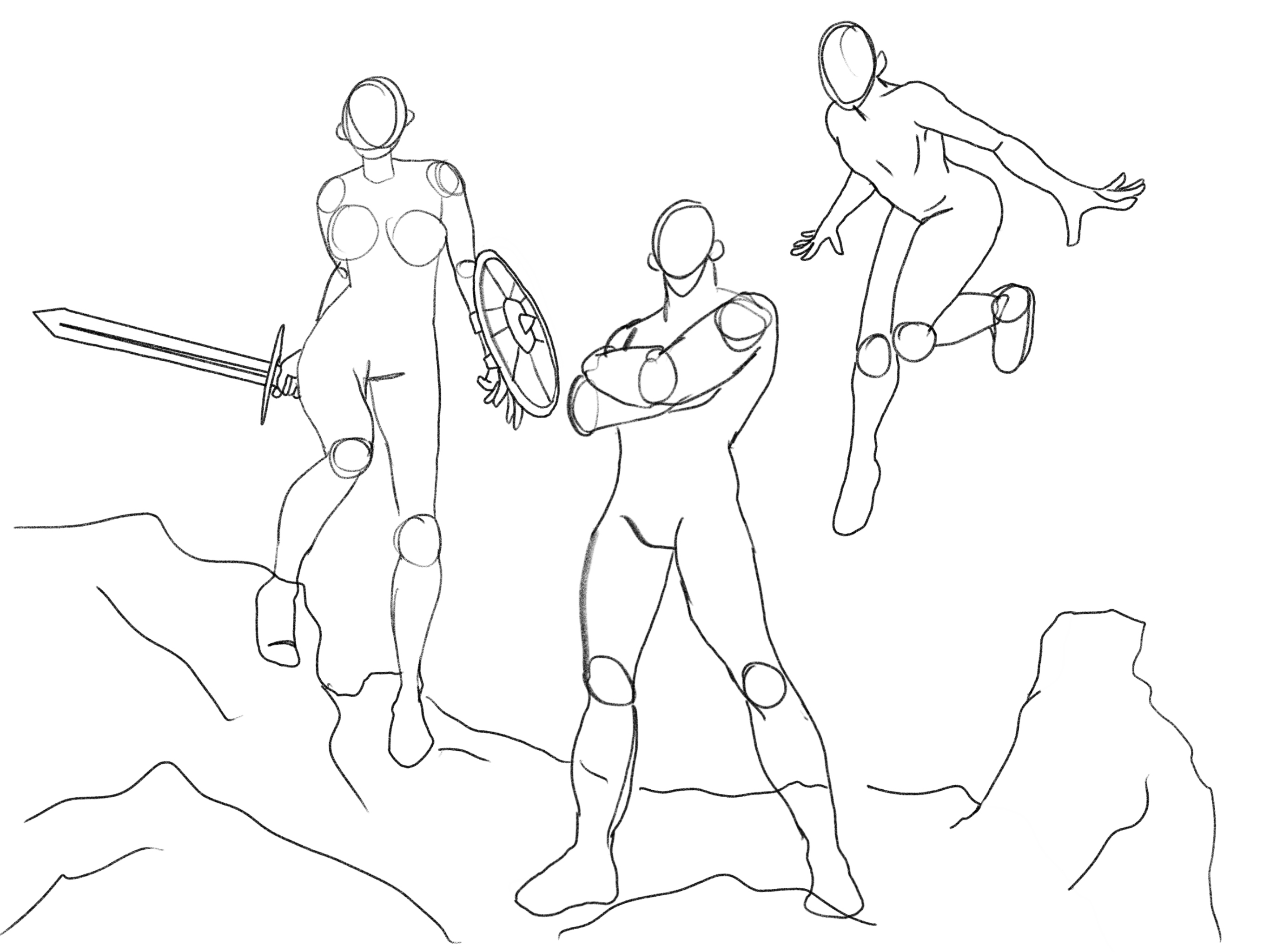 Below I have a step-by-step process of me working on a piece. I usually start a piece by blocking out the figures in a simple stick form, before adding contour lines and then adding limited details.